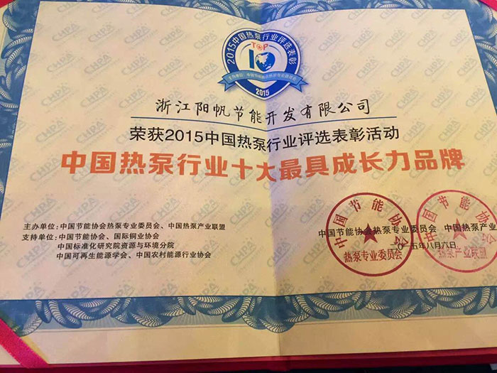 2015年8月6日,2015年中国热泵产业年会暨第四届亚洲空气源热泵论坛在南京国际会议大酒店隆重召开。本次会议由中国节能协会和国际铜业协会主办,中国热泵产业联盟、中国节能协会热泵专业委员会承办。阳帆空气能气能荣获2015年度中国“热泵行业十大最具成长力品牌 ”