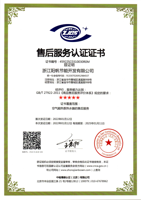 新春过后,很多人尚沉浸在春节的余味之中,而从2022年的日历来看,二月已经过半,三月即将开启。在开工后不久,浙江阳帆节能开发有限公司就传来喜讯,获得权威机构颁发的五星售后服务认证证书,经评价,服务能力达到GB/T 27922-2011《商品售后服务评价体系》规定的要求,证书覆盖范围为空气能热泵热水器的售后服务。