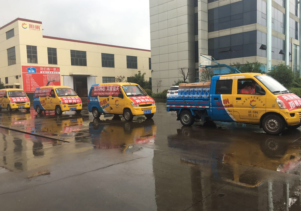 自灾情发生后,阳帆总经理叶萍女士就一直关注汛期情况,当得知前线官兵奋战10多个小时没有休息,灾区人民急需水和食物时,她巾帼不让须眉,主动带队奔赴抗洪第一线,并身先士卒为抗洪军民送去最急需的水和食物。6月26日下午2点,收到汛情的浙江金华阳帆空气能迅速行动,紧急调运物资,先期筹集3顶帐篷,300箱矿泉水、60箱方便面与10箱方便面装满了5辆车,20多人奔赴抗洪第一线,为抗洪救灾贡献自己的一份力量,彰显阳帆空气能的社会责任感,弘扬了新能源企业的使命感。